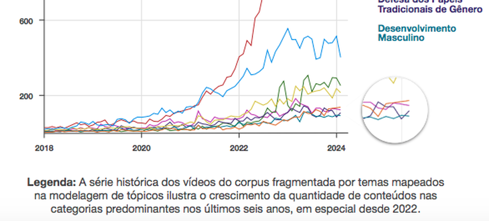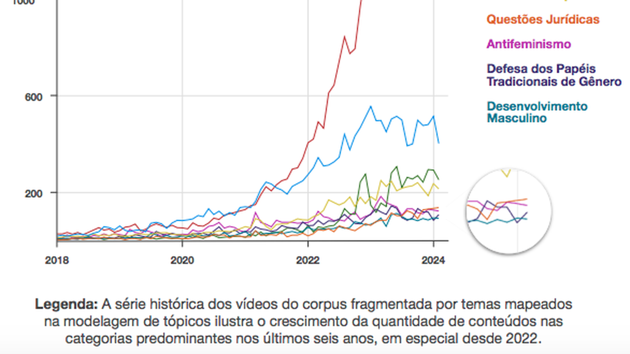 O estudo ainda observou de maneira qualitativa os vídeos de 137 canais com conteúdos explicitamente misóginos. Juntos, eles publicaram, nos últimos seis anos, mais de 105 mil vídeos. Em média, têm 152 mil inscritos e somam 3,9 bilhões de visualizações em seus conteúdos, evidenciando a relevância desse ecossistema tóxico no ambiente digital.