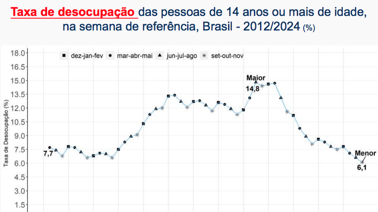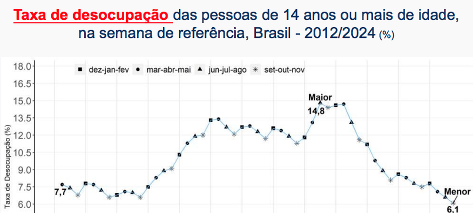 (Brasília-DF, 27/12/2024). Na manhã desta sexta-feira, 27, o IBGE divulgou a PNAD Continua no trimestre encerrado em novembro de 2024 que registrou a taxa de desocupação de 6,1% com um recuo de 0,5 ponto percentual (p.p.) frente ao trimestre de junho a agosto de 2024 (6,6%) e caiu 1,4 p.p. ante o mesmo trimestre móvel de 2023 (7,5%). Esta foi a menor taxa de desocupação da série histórica da PNAD Contínua, iniciada em 2012