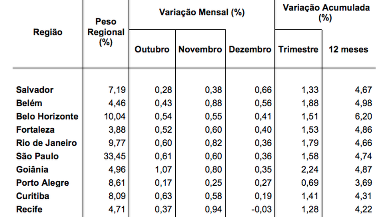 Quanto aos índices regionais, nove das onze áreas de abrangência tiveram alta em dezembro. A maior variação foi observada em Salvador (0,66%), por conta das altas da gasolina (4,54%) e da passagem aérea (15,35%). Já o menor resultado ocorreu em Brasília (-0,04%), que registrou queda nos preços da energia elétrica residencial (-7,66%) e da gasolina (-3,03%).