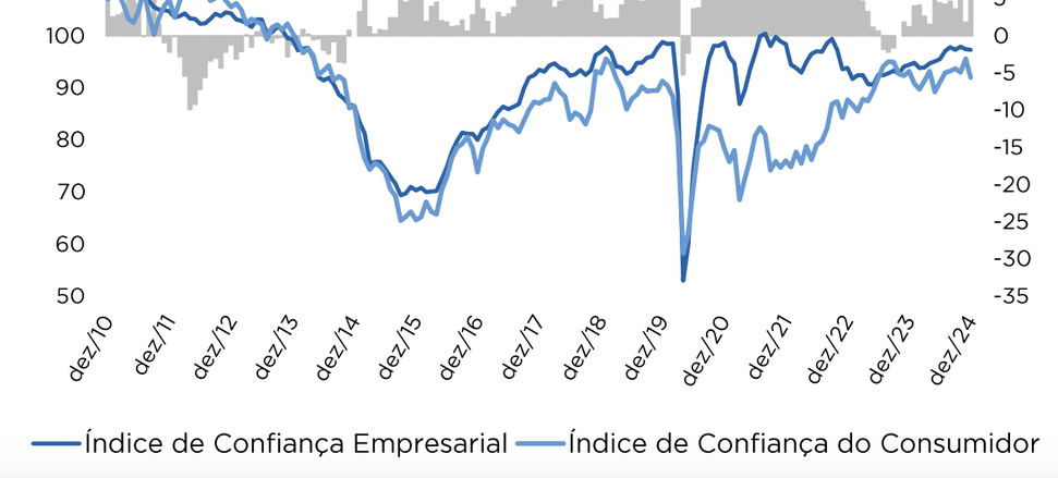 Por um lado, os empresários têm reportado sinalização de demanda aquecida, retratando o ritmo favorável da economia brasileira. Por outro lado, a piora nas expectativas, disseminada entre os setores, sugere que 2025 será um ano mais desafiador.
