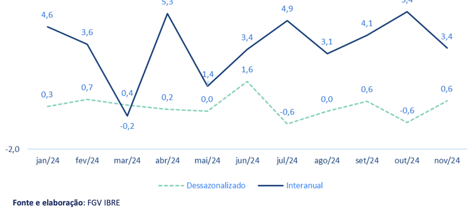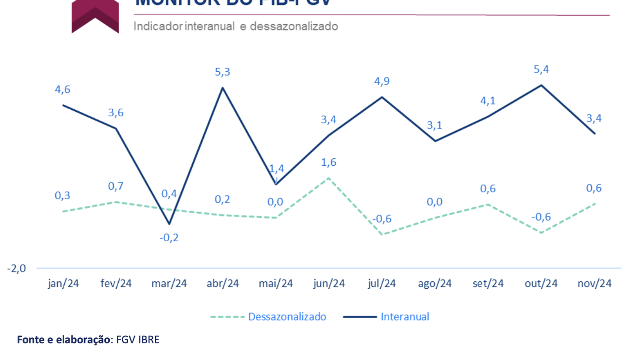 (Brasília-DF, 17/01/2025). Na manhã desta sexta-feira, 17, a FGV-Ibre divulgou o seu Monitor PIB-FGV apontando crescimento de 0,6% na atividade econômica em novembro comparado com outubro de 2024. Em comparação ao mesmo mês de 2023, o crescimento de novembro foi de 3,4%. A taxa acumulada em 12 meses até novembro foi de 3,4%.