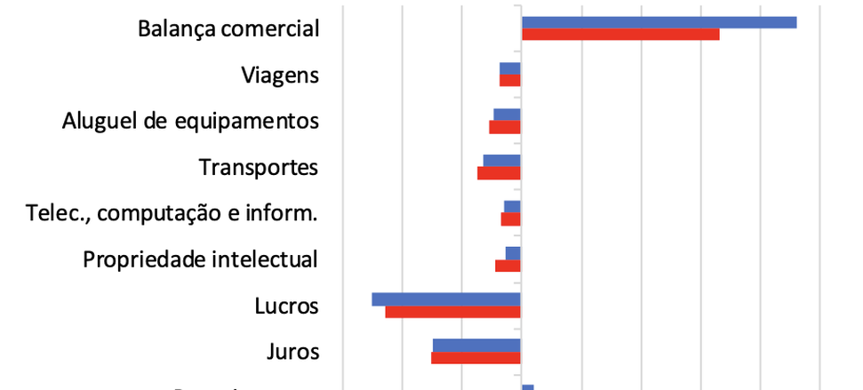 O déficit na conta de serviços totalizou US$4,6 bilhões em dezembro de 2024, 27,3% superior ao déficit de US$3,6 bilhões registrado em dezembro de 2023. A conta de transportes registrou despesas líquidas de US$1,4 bilhão, aumento de 27,0% na comparação com dezembro de 2023, impulsionadas pelas elevações do volume importado e do custo de frete. Os serviços de propriedade intelectual registraram despesas líquidas de US$841 milhões, aumento de 14,6% ante US$733 milhões em dezembro de 2023. As despesas líquidas com viagens internacionais alcançaram US$568 milhões, aumento de 23,7% em relação a dezembro de 2023, com acréscimos de 16,0% nas receitas (para US$721 milhões) e de 19,2% nas despesas (para US$1,3 bilhão).