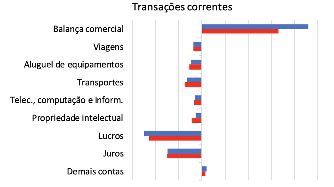 As transações correntes do balanço de pagamentos foram deficitárias em US$9,0 bilhões em dezembro de 2024, ante déficit de US$5,6 bilhões em dezembro de 2023. Na comparação interanual, o superávit comercial diminuiu US$4,3 bilhões; o déficit em serviços aumentou US$1,0 bilhão; o déficit em renda primária diminuiu US$1,5 bilhão; e o superávit em renda secundária aumentou US$360 milhões.