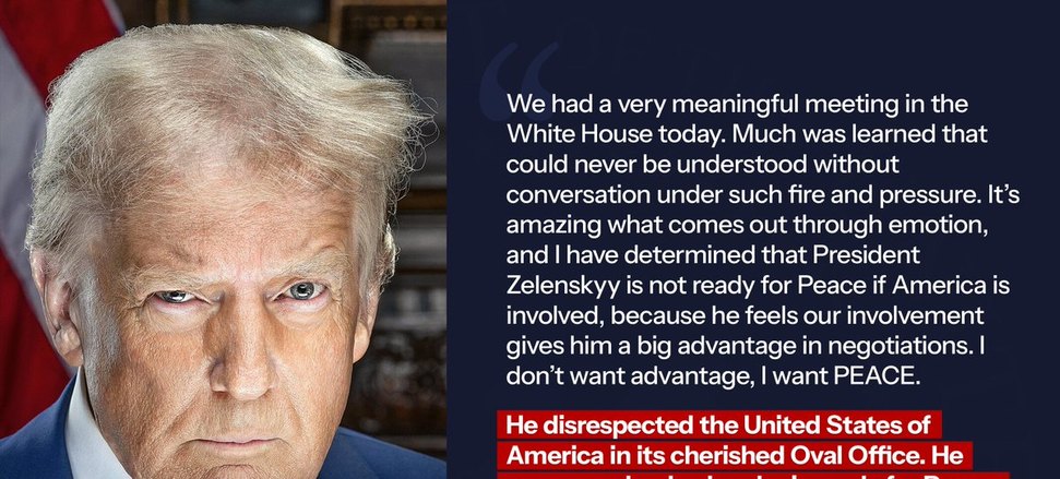 “Tivemos uma reunião muito significativa na Casa Branca hoje. Muito foi aprendido que nunca poderia ser compreendido sem uma conversa sob tanto fogo e pressão. É incrível o que sai através da emoção, e eu determinei que o Presidente Zelenskyy não está pronto para a Paz se a América estiver envolvida, porque ele sente que nosso envolvimento lhe dá uma grande vantagem nas negociações. Eu não quero vantagem, eu quero PAZ.