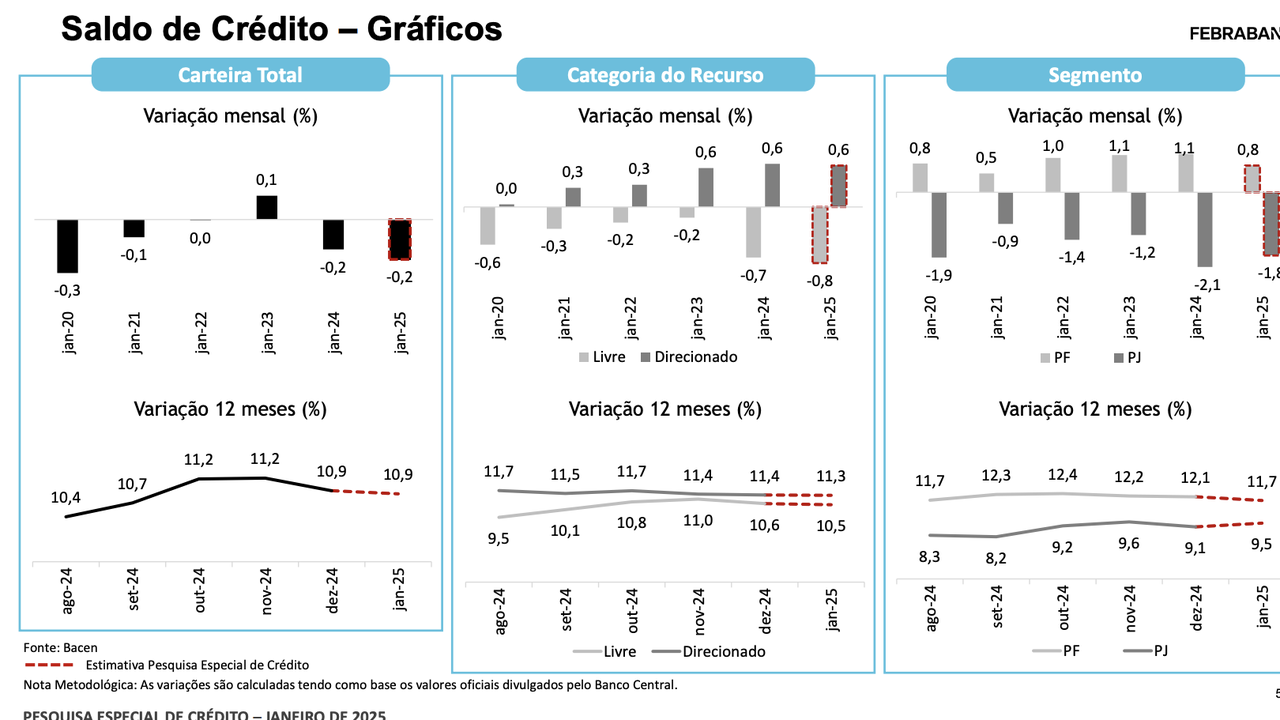 (Brasília-DF, 06/03/2025) Nesta quarta-feira, 05, a Febraban divulgou a Pesquisa Especial de Crédito da Febraban que é divulgada mensalmente como uma prévia da Nota de Política Monetária e Operações de Crédito do Banco Central.
