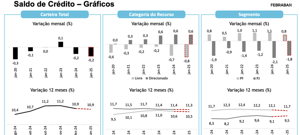 “A retração do crédito no primeiro mês do ano é um movimento usual, reflexo de fatores sazonais expressivos. No entanto, ao ajustarmos esses efeitos, os dados da pesquisa indicam que o crédito inicia 2025 mantendo um bom ritmo de crescimento, ainda que com sinais de desaceleração, especialmente nas linhas mais sensíveis ao ciclo econômico, que sofrem com inflação e juros mais elevados", afirma Rubens Sardenberg, diretor de Economia da Febraban.