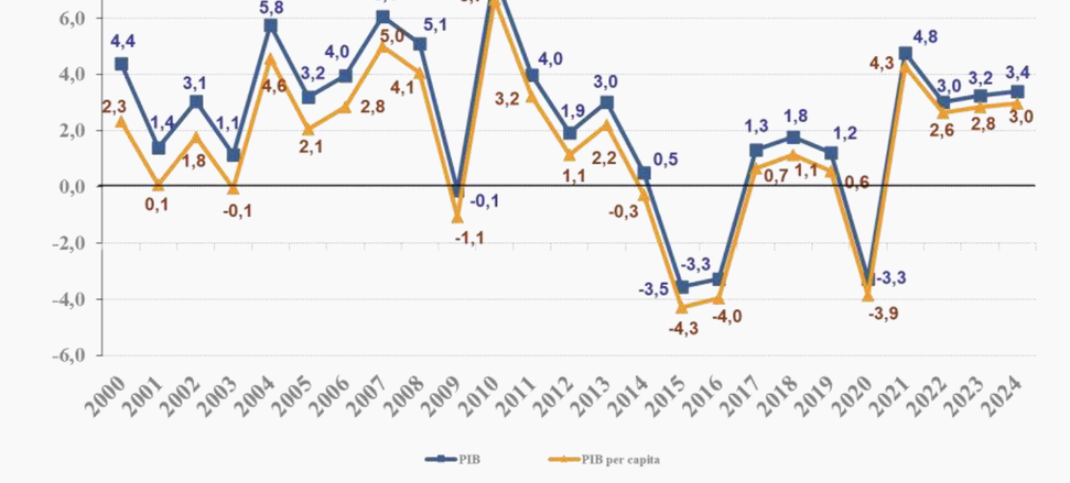 (Brasília-DF, 07/03/2025). Na manhã desta sexta-feira, 07, como já era previsto o IBGE divulgou o PIB (Produto Interno Bruto) de 2024 que cresceu 3,4% frente a 2023. A Indústria (3,3%) e os Serviços (3,7%) cresceram, enquanto a Agropecuária recuou (-3,2%).