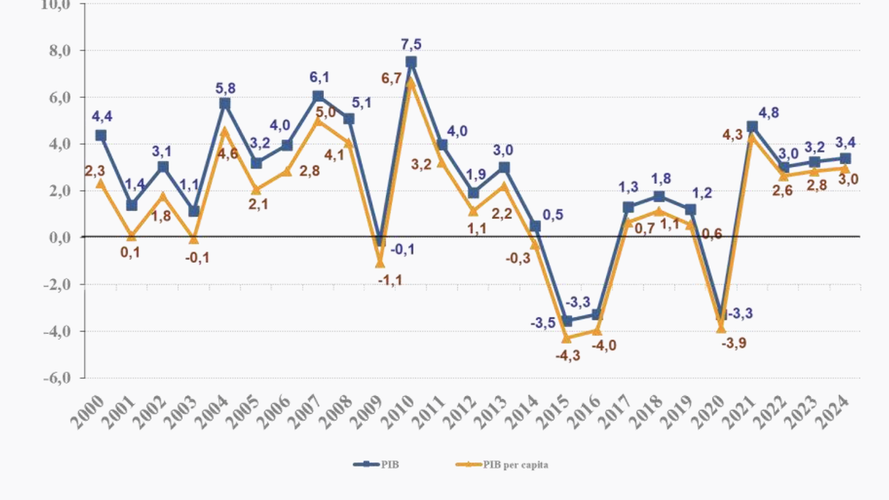 Em valores correntes, o PIB totalizou R$ 11,7 trilhões em 2024. Já o PIB per capita chegou a R$ 55.247,45, com avanço real de 3,0% frente ao ano anterior.