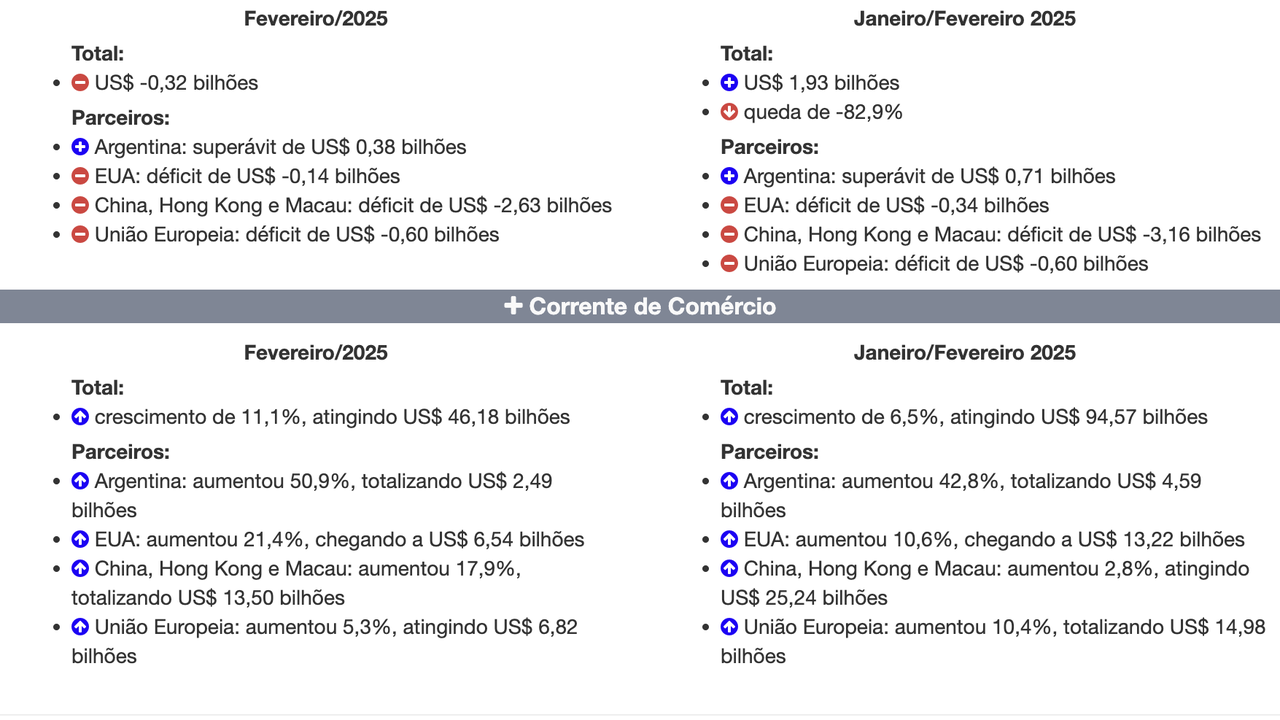 No mês de fevereiro de 2025, as exportações somaram US$ 22,93 bilhões e as importações, US$ 23,25 bilhões, resultando em um saldo comercial negativo de US$ 0,32 bilhão. A corrente de comércio totalizou US$ 46,18 bilhões, representando um crescimento de 11,1% na comparação com fevereiro de 2024.