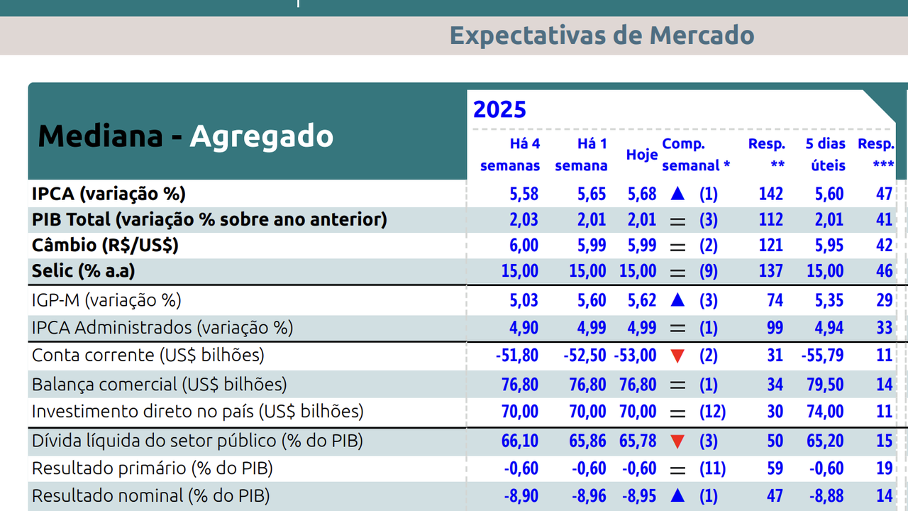 (Brasília-DF, 11/03/2025) A Política Real teve acesso ao relatório da pesquisa Focus do Banco Central que foi finalizada na sexta-feira, 07, e divulgada nesta segunda-feira, 10 apontando que o IPCA está estimado em 5,68%