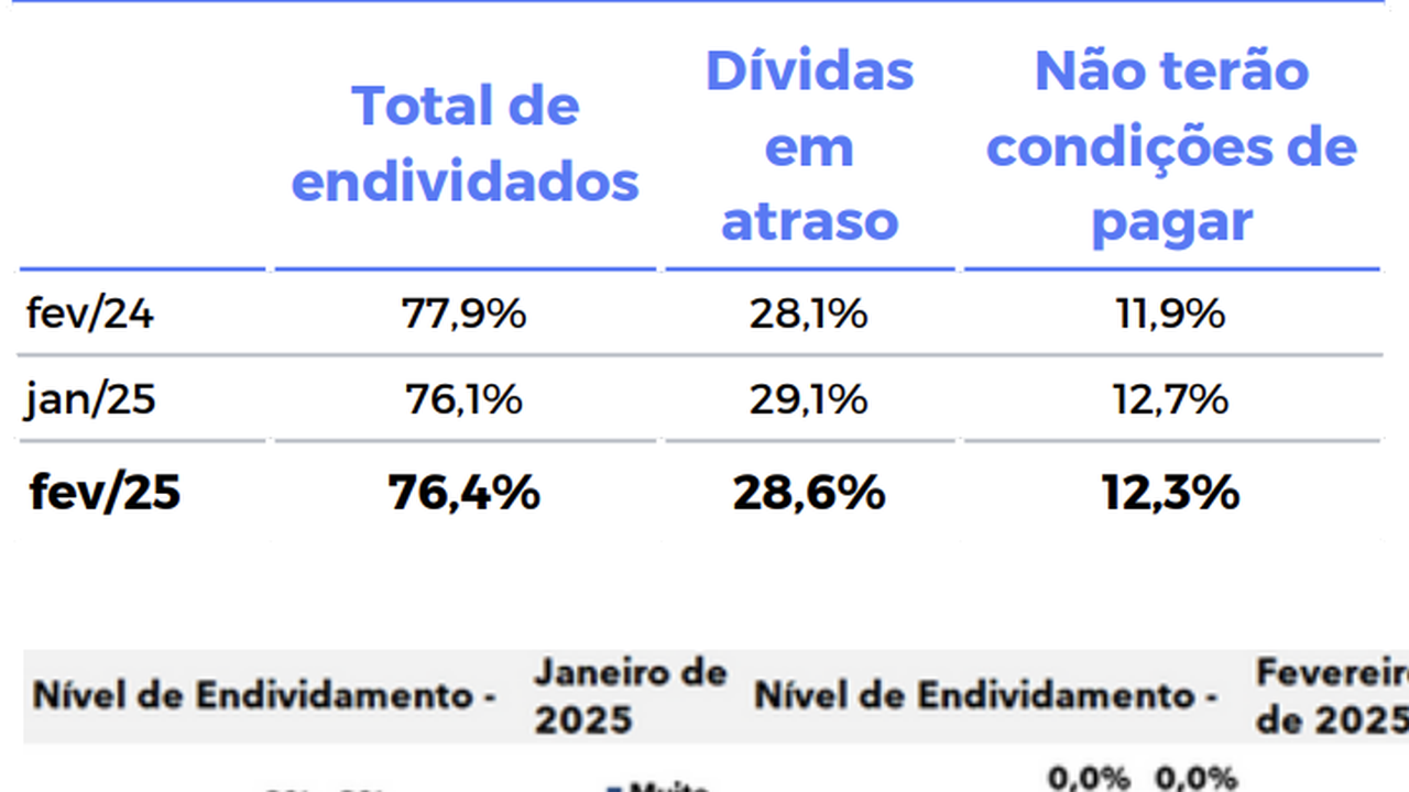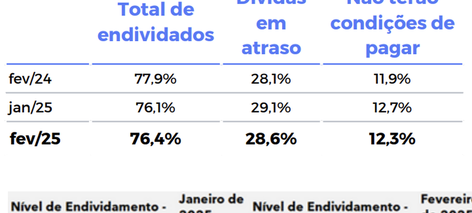 (Brasília-DF, 11/03/2025). Na manhã desta segunda-feira, 10, a Confederação Nacional do Comércio de Bens, Serviços e Turismo (CNC) divulgou a sua Pesquisa de Endividamento e Inadimplência do Consumidor (Peic) de fevereiro que indica que o percentual de famílias que informaram ter dívidas a vencer, seja por conta de cartão de crédito, cheque especial, carnê de loja, crédito consignado, empréstimo pessoal, cheque pré-datado e prestações de carro e casa, voltou a crescer após duas quedas consecutivas, chegando 76,4% em fevereiro de 2025.
