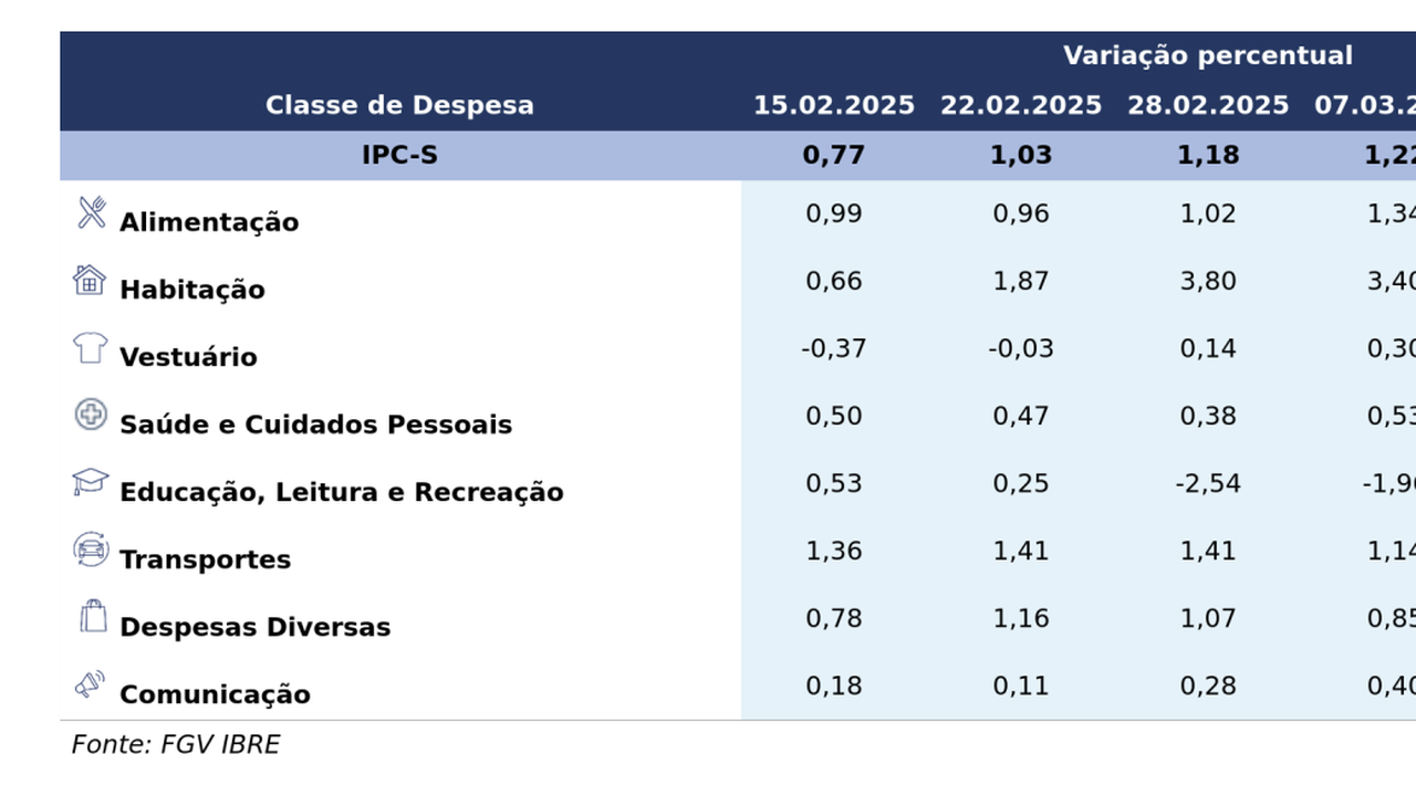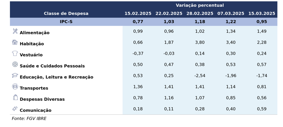 Nesta apuração, quatro das oito classes de despesa componentes do índice registraram decréscimo em suas taxas de variação. A maior contribuição para o resultado do IPC-S partiu do grupo Habitação cuja taxa de variação passou de 3,40%, na primeira quadrissemana de março de 2025 para 2,28% na segunda quadrissemana de março de 2025.