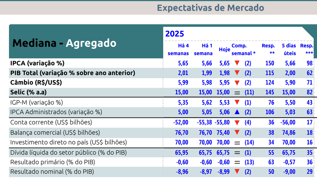 (Brasília-DF, 25/03/2025) Na manhã desta segunda-feira,24, o Banco Central divulgiu a sua pesquisa Focus, realizada junto ao mercado ainda na sexta-feira, 21, apontando que pela segunda semana seguida os agentes de mercado avaliaram a inflação oficial, o IPCA, o crescimento econômico, PIB, o câmbio, dólar, em recuo.