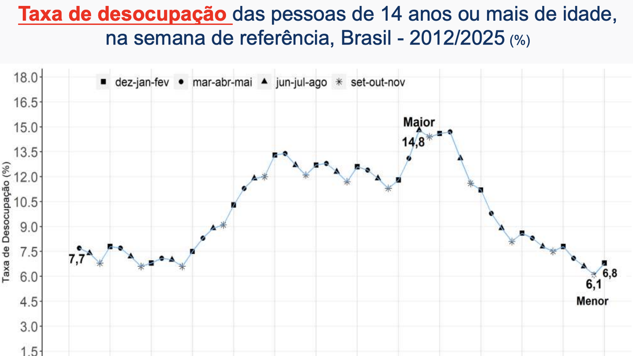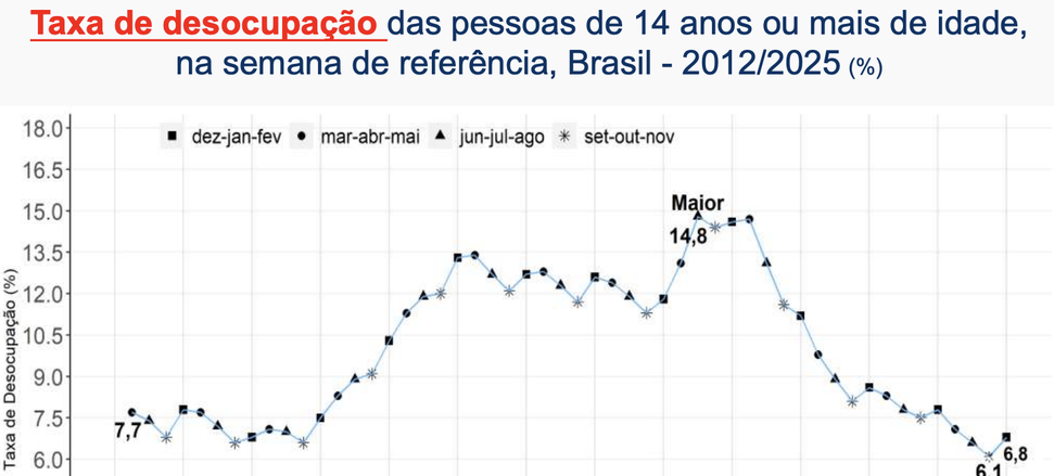 (Brasília-DF, 28/03/2025) Na manhã desta sexta-feira, 28, como já era programado foi divulgado a chamada PNAD Contínua do trimestre encerrado em fevereiro de 2025 que apontou que a taxa de desocupação chegou a 6,8%, cresceu 0,7 ponto percentual (p.p.) frente ao trimestre anterior (6,1%) e caiu 1,1 p.p. ante o trimestre móvel encerrado em fevereiro de 2024 (7,8%).