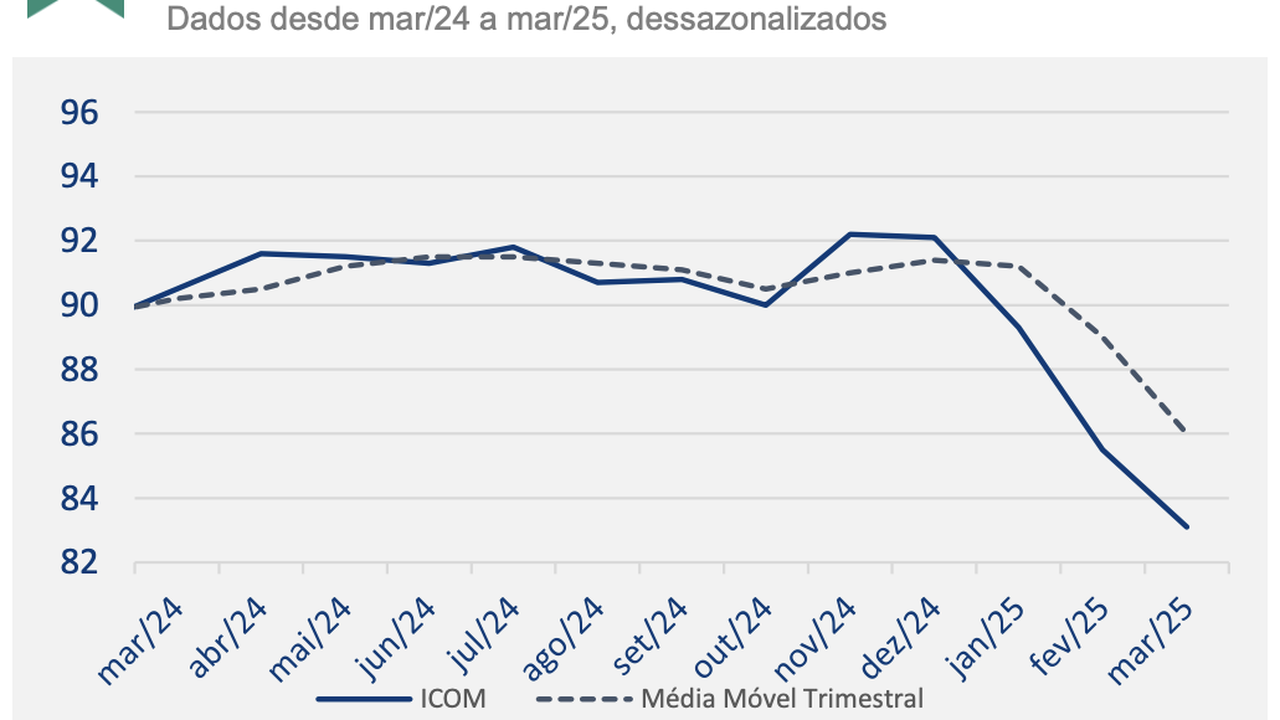 (Brasília-DF, 28/03/2025) Também neste manhã, o FGV-IBRE divulgou o seu índice de Confiança do Comércio (ICOM) que caiu 2,4 pontos em março para 83,1 pontos, menor nível desde de março 2021 (73,8 pontos). Em médias móveis trimestrais houve queda de 3,0 pontos, para 86,0 pontos.