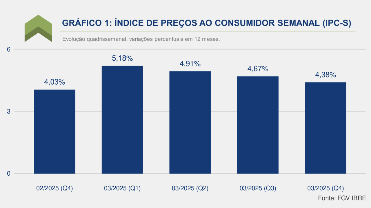 (Brasília-DF, 02/04/2025) Na manhã desta terça-feira, 01, o FGV-IBRE divulgou o seu IPC-S da quarta quadrissemana de março de 2025 subiu 0,44% e acumula alta de 4,38% nos últimos 12 meses.