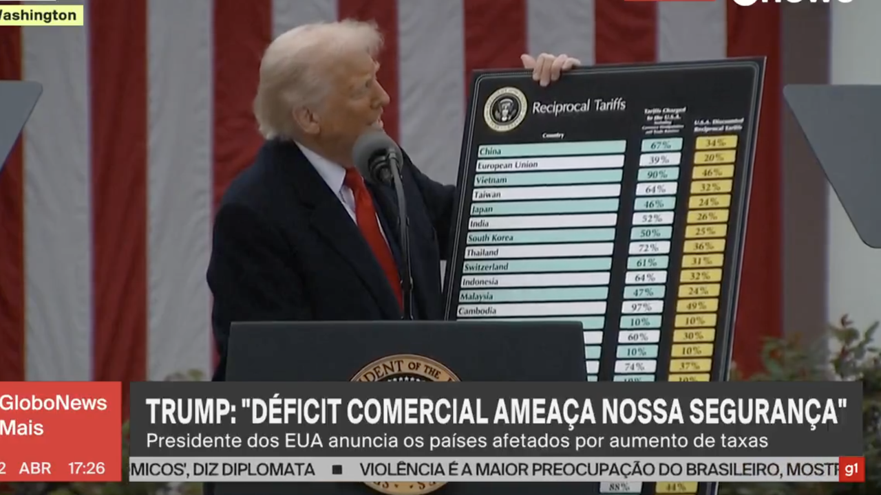 No anúncio, o presidente disse que vai impor uma tarifa de 10% sobre os produtos brasileiros, o mesmo valor que o Brasil cobra dos americanos, segundo Trump.