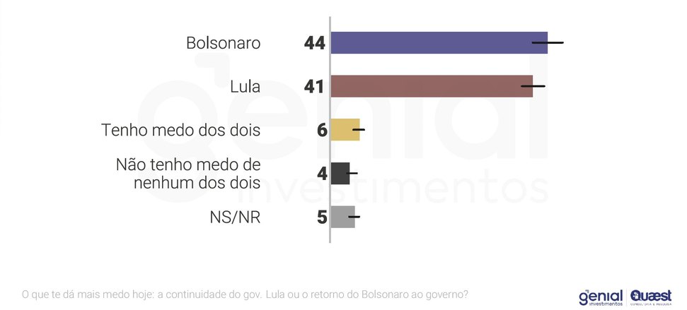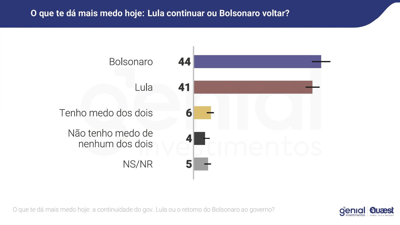 Por outro lado, foi revelado, pois perguntado aos eleitores, sobre o que punha mais medo nas pessoas se um novo mandato, o quarto, do presidente Luiz Inácio Lula da Silva ou retorno do presidente Jair Bolsonaro. A pesquisa revela que o eleitorado tem mais medo do retorno de Bolsonaro que um outro mandato de Lula.