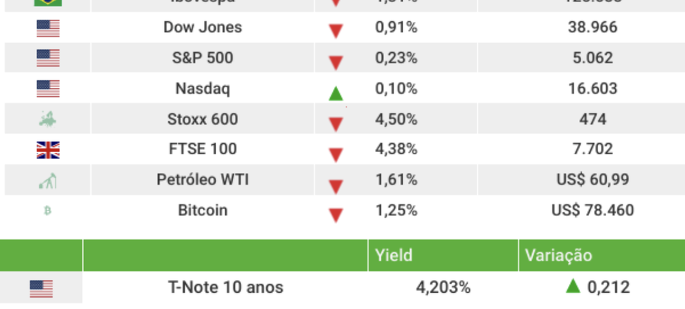 (Brasília-DF, 08/04/2025). Nesta segunda-feira, 7, em novo dia de turbulência global nos mercados, o Ibovespa fechou em baixa de 1,31% aos 125.588 pontos. A queda acumulada nos últimos dois pregões já soma 3,27%.