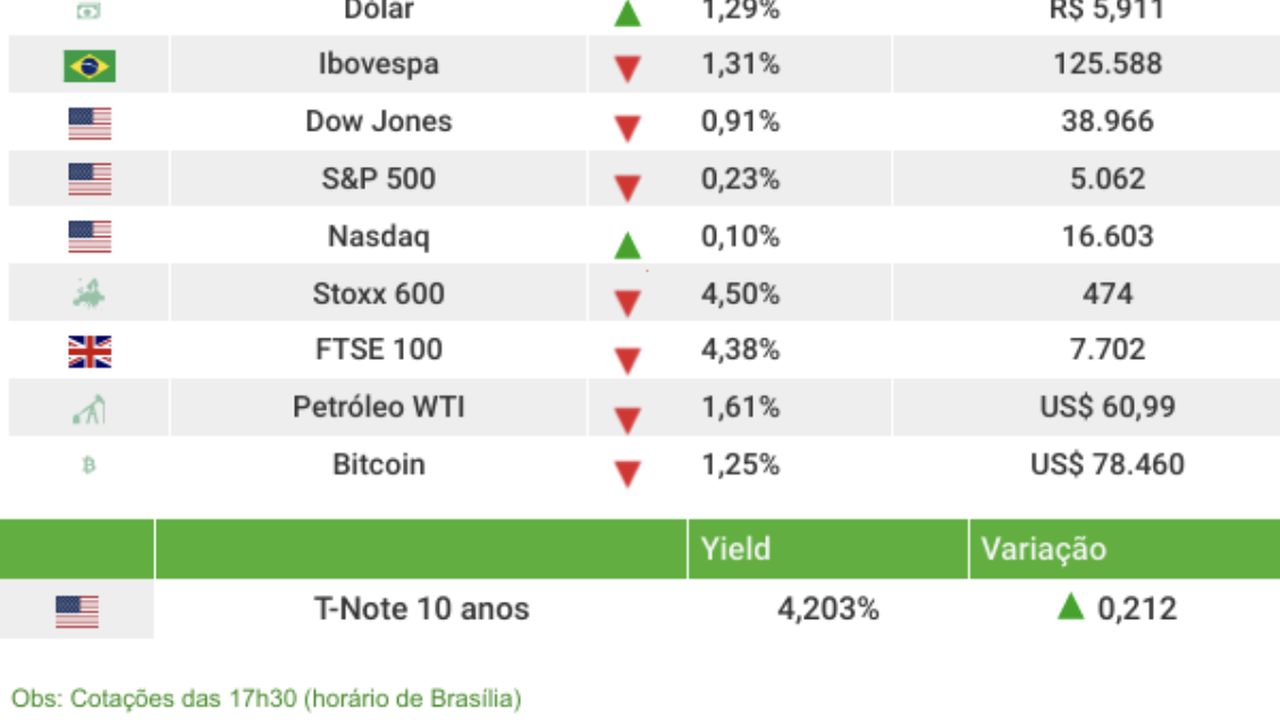 MERCADO: Ibovespa, com a crise das tarifas, fechou em baixa de 1,31% e a moeda americana avançou 1,29% contra o real, cotada a R$ 5,91