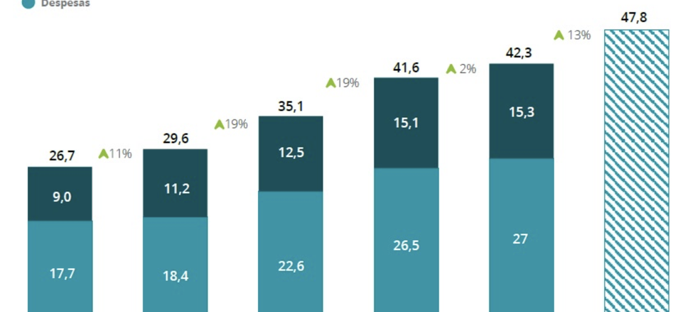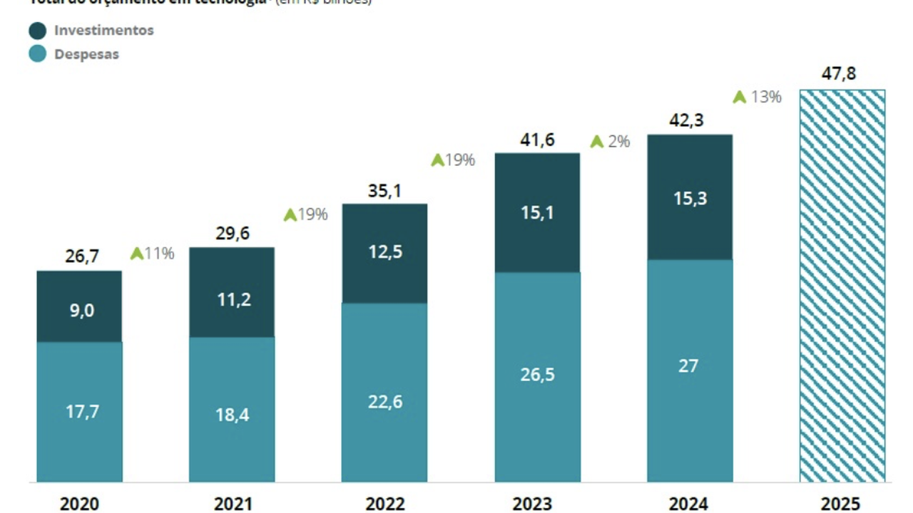 O orçamento total dos bancos brasileiros destinado à tecnologia, englobando despesas e investimentos, deverá atingir, neste ano, R$ 47,8 bilhões, um aumento de 13% em relação a 2024, quando foi de R$ 42,3 bilhões. É o que revela o 1º volume da Pesquisa Febraban de Tecnologia Bancária 2025, realizada pela Deloitte, maior organização de serviços profissionais do mundo. A estimativa foi calculada com base nos valores indicados pelos bancos participantes. A pesquisa mostra que os bancos aumentaram seus investimentos em tecnologia em 58,4% nos últimos cinco anos.