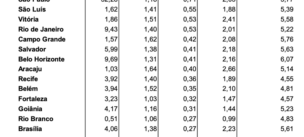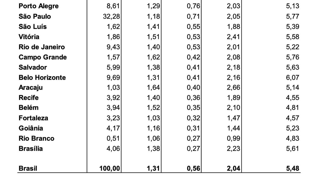 Quanto aos índices regionais, a maior variação ocorreu em Curitiba (0,79%), influenciada pela alta da gasolina (1,84%). A menor variação ocorreu em Brasília (-0,33%), com a redução de 24,18% no ônibus urbano.