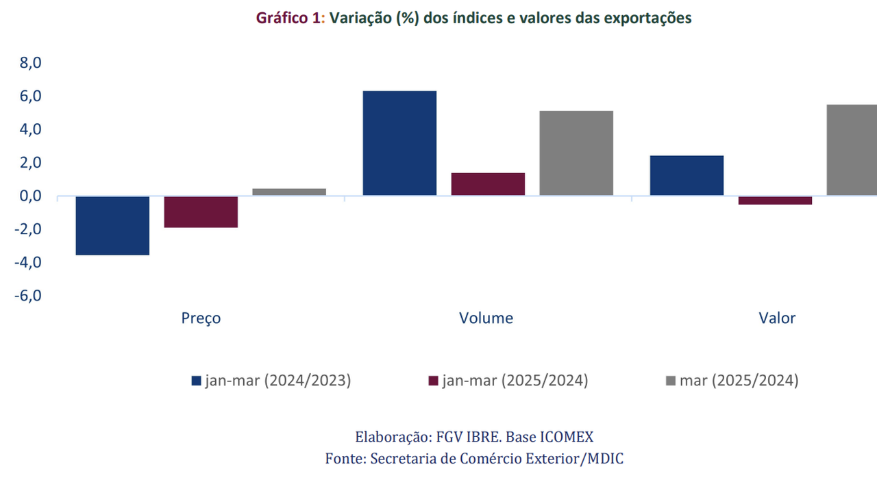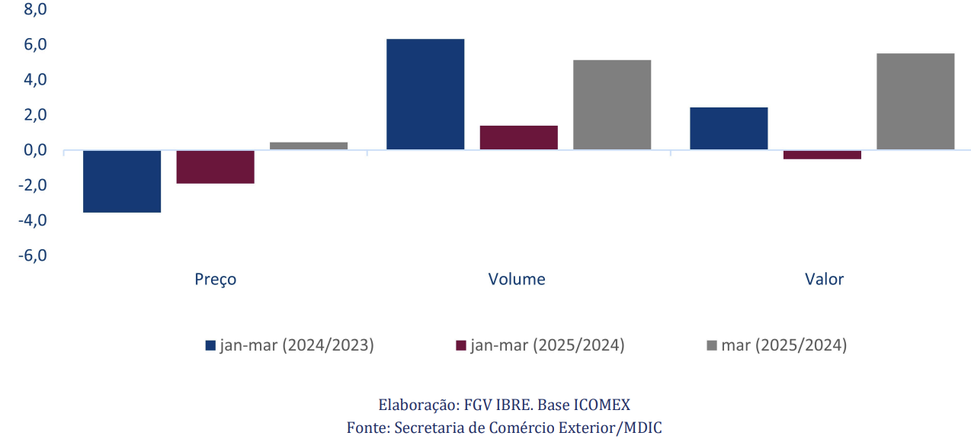 Entre os meses de março de 2024 e 2025, o valor aumentou 5,5%, liderado pelo crescimento do volume em 5,1%. No entanto, esse aumento não compensou a queda no mês de janeiro e o crescimento de 0,9% em fevereiro, entre 2024 e 2025. Assim, na comparação entre as variações entre o primeiro trimestre de 2024 com o de 2023 e do primeiro trimestre de 2025 com o de 2024, observa-se a redução na variação do volume. Essa passou de um aumento de 6,3% (2024/2023) para um aumento de 1,4% (2025/2024). Esse resultado levou a um recuo de 0,5% no valor exportado em 2025.