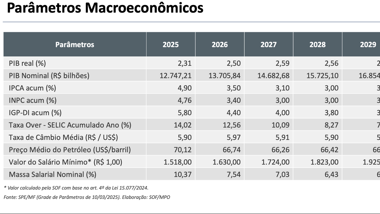 O texto enviado ao Congresso prevê taxa de câmbio média a R$ 5,97 para 2026, R$ 5,91 em 2027, R$ 5,07 em 2028 e R$ 5,10 para 2029. O projeto também estima o preço médio do barril do petróleo (usado para estimar receitas da União com royalties) em US$ 66,74 no próximo ano, US$ 66,26 em 2027, US$ 66,42 em 2028 e US$ 66,65 em 2029.