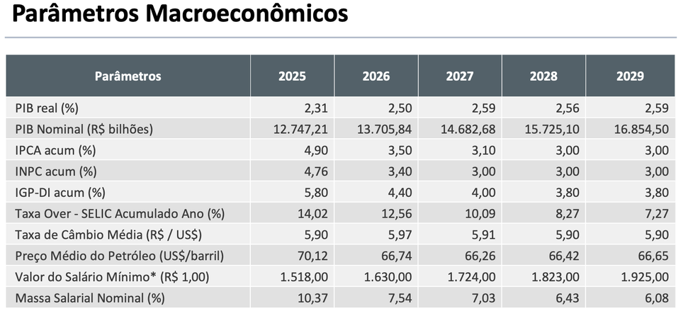 O projeto também prevê taxa Selic (juros básicos da economia) acumulada em 12,56% ao ano para 2026, 10,09% para 2027, 8,27% para 2028 e 7,27% para 2029. Atualmente, a Selic está em 14,25% ao ano.