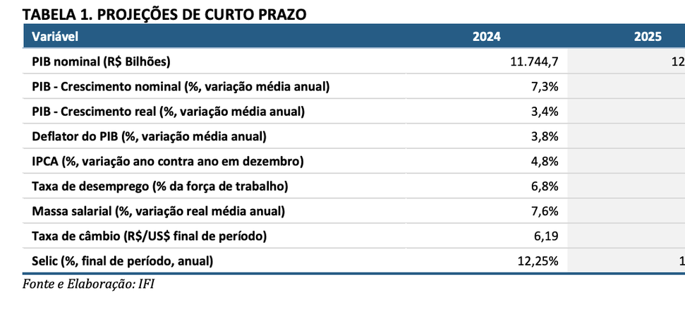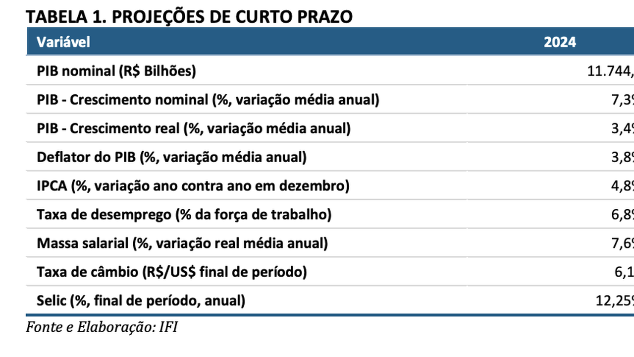 A partir das premissas macroeconômicas analisada pela IFI, eles projetam desaceleração da economia, dos 3,4% em 2024, para 2,0%, em 2025, e 1,6%,em 2026.
