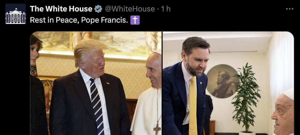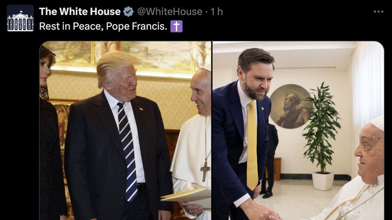 A Casa Branca também prestou homenagem ao papa em uma publicação no X. "Descanse em paz, Papa Francisco", diz a publicação, juntamente com uma foto do papa se encontrando com o presidente dos EUA, Donald Trump, e sua esposa.