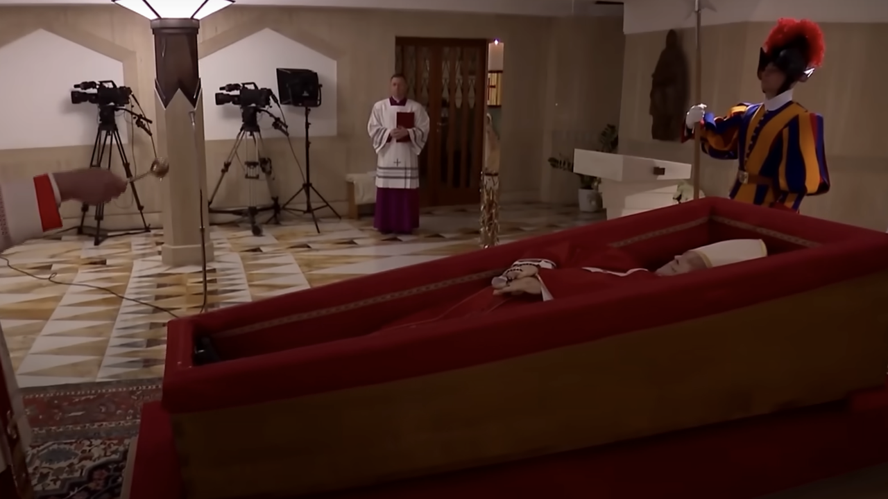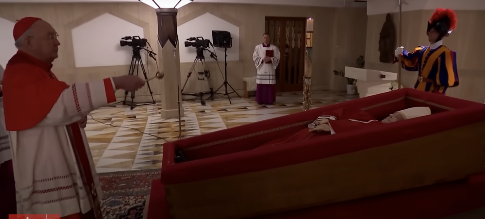 As imagens também mostram o Cardeal Kevin Joseph Farrell abençoando o corpo do falecido papa durante o rito da declaração de óbito.