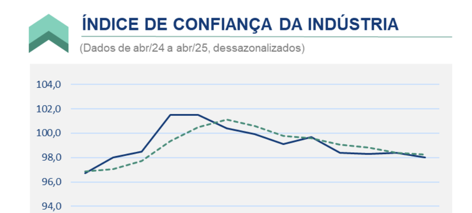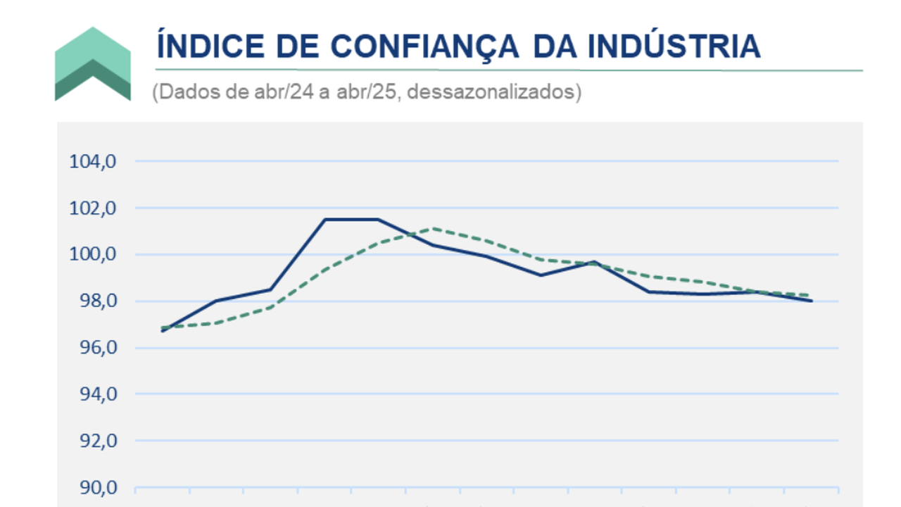 (Brasília-DF, 29/04/2025). Na manhã desta segunda-feira, 28, a FGV-IBRE divulgou o seu Índice de Confiança da Indústria (ICI) que caiu 0,4 ponto em abril, para 98,0 pontos. Em médias móveis trimestrais, o índice recuou 0,2 ponto, também para 98,2 pontos.