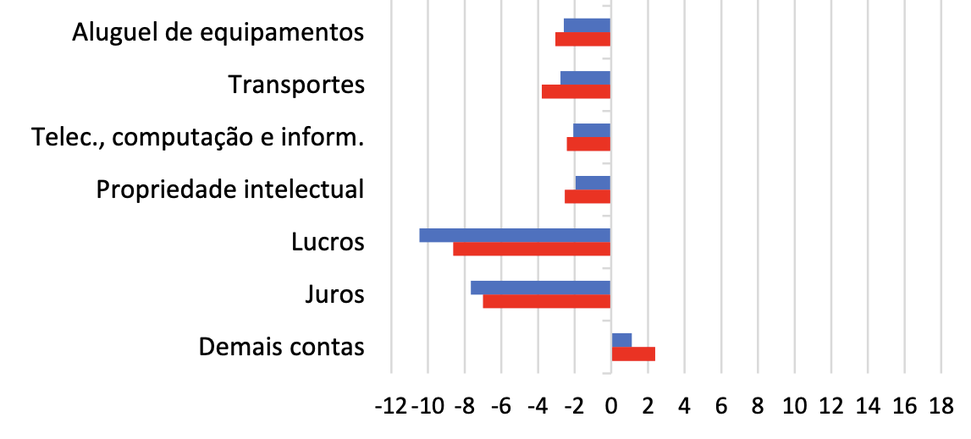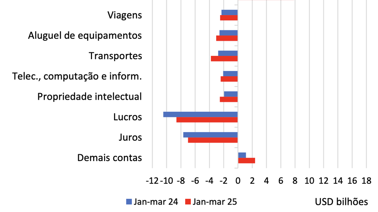 O déficit na conta de serviços totalizou US$4,4 bilhões em março de 2025, aumento de US$460 milhões em relação a março de 2024. Nessa base de comparação, aumentaram as despesas líquidas de serviços de propriedade intelectual, 70,5%, totalizando US$1,1 bilhão; de transportes, 20,3%, totalizando US$1,1 bilhão; e de aluguel de equipamentos, 15,2%, acumulando US$1,1 bilhão. As despesas líquidas com viagens internacionais aumentaram 0,2%, para US$766 milhões, resultado dos aumentos de despesas, 13,4% (para US$1,5 bilhão), quanto de receitas, 30,6% (para US$773 milhões).