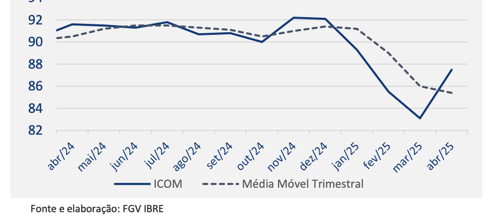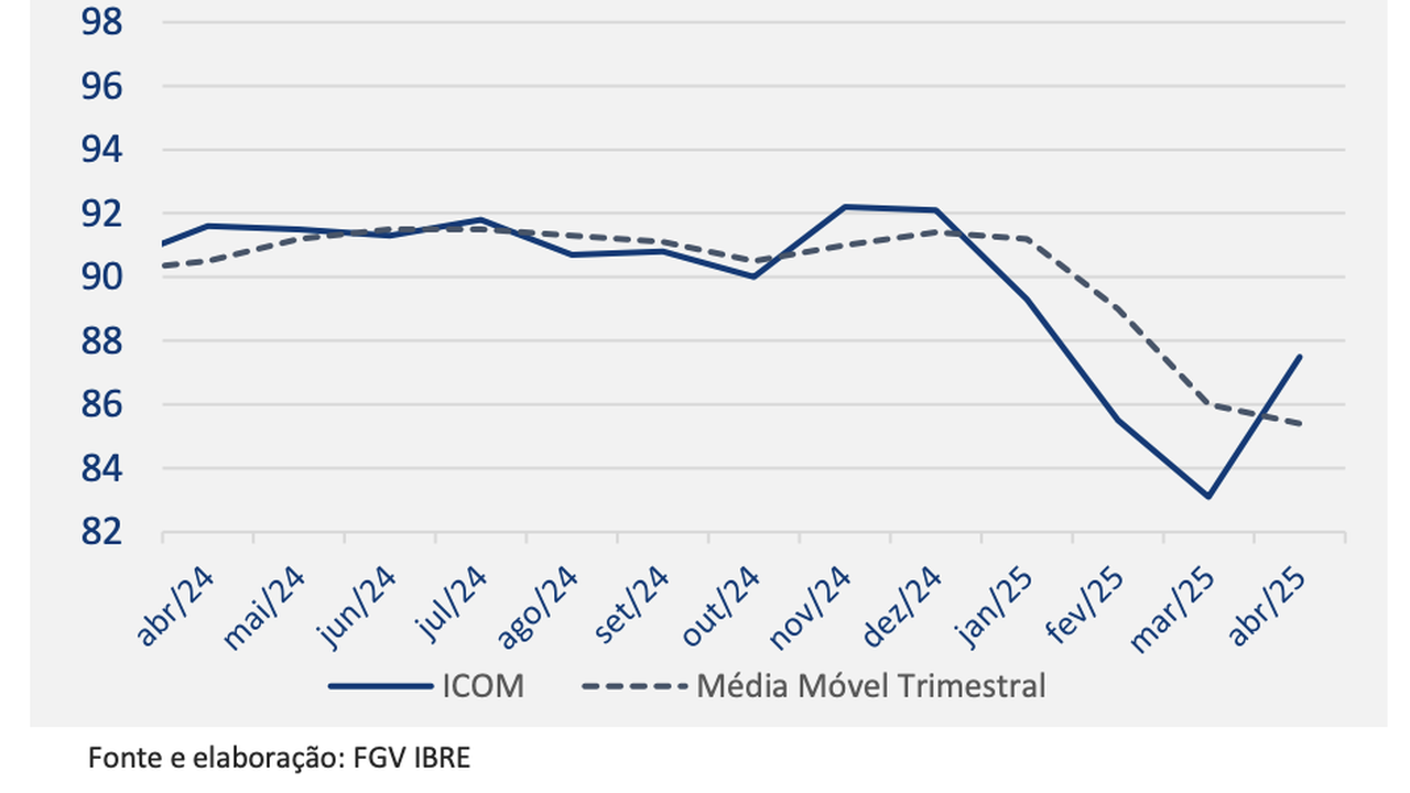 (Brasília-DF, 30/04/2025). Na manhã desta terça-feira, 29, a FGV-IBRE divulgou o índice de Confiança do Comércio (ICOM) do FGV que cresceu 4,4 pontos em abril para 87,5 pontos. Apesar da interrupção das quedas, em médias móveis trimestrais, houve queda de 0,6 ponto, para 85,4 pontos.
