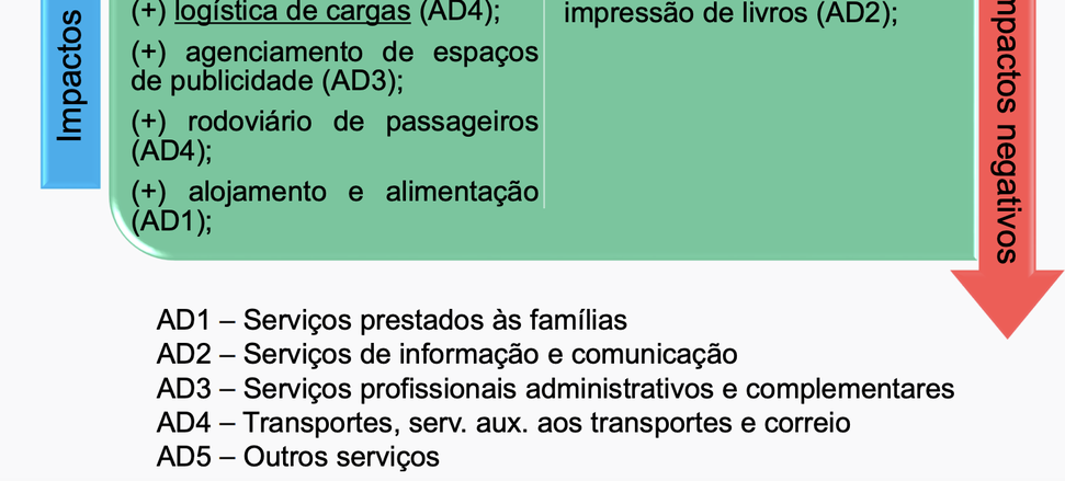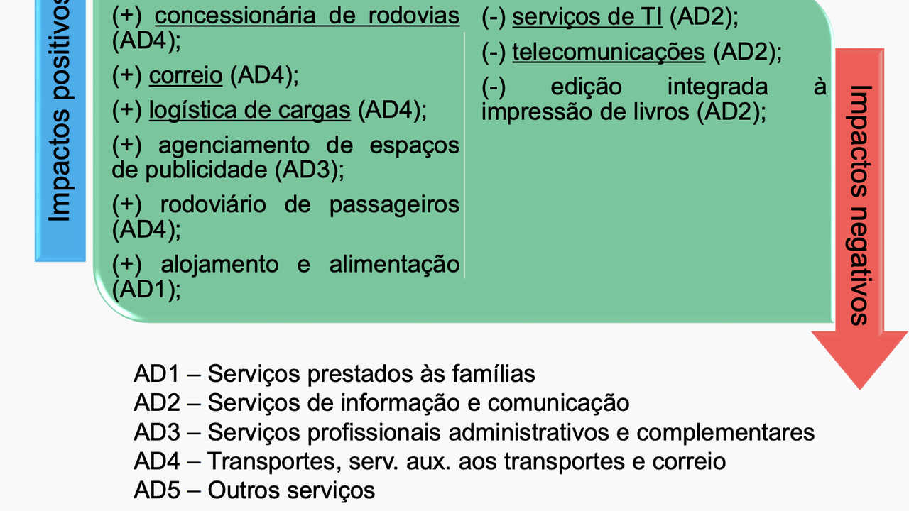 Os demais avanços vieram dos transportes, serviços auxiliares aos transportes e correio (1,2%); dos serviços prestados às famílias (3,5%); e dos serviços profissionais, administrativos e complementares (1,2%), explicados, em grande parte, pela maior receita vinda de logística de cargas; transporte aéreo de passageiros; navegação interior de carga; e transporte dutoviário, no primeiro ramo; de hotéis; restaurantes; serviços de bufê; e atividades de condicionamento físico, no segundo; e de agenciamento de espaços de publicidade; consultoria em gestão empresarial; serviços de reservas relacionados a hospedagens; e atividades de cobranças e informações cadastrais, no último.