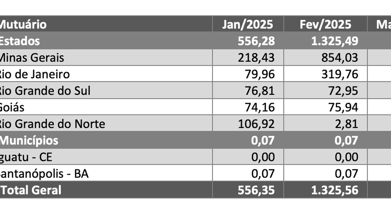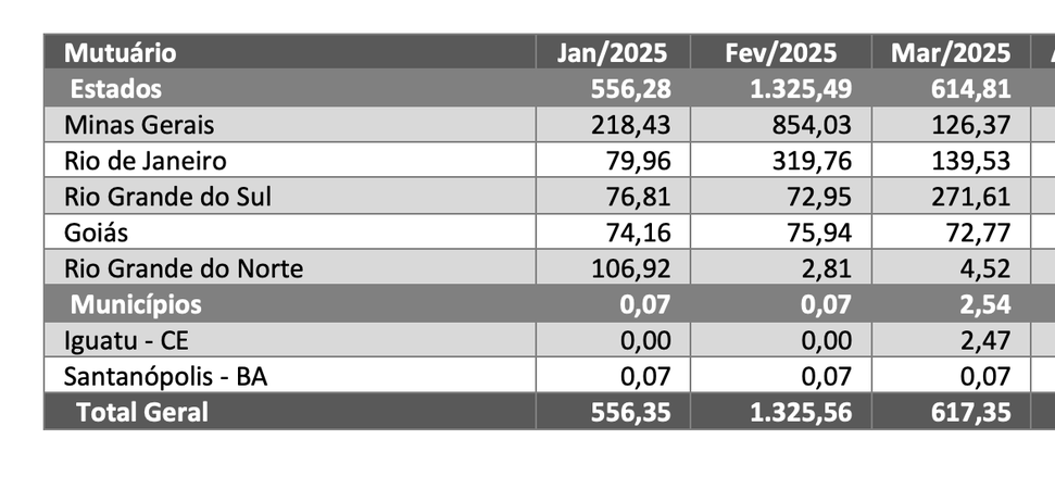 Os mutuários que tiveram os maiores valores honrados no ano foram os estados de Minas Gerais (R$ 1,52 bilhão, ou 45,66% do total), do Rio de Janeiro (R$ 884,60 milhões, ou 26,64% do total), do Rio Grande do Sul (R$ 503,49 milhões, ou 15,17% do total) e de Goiás (R$ 296,18 milhões, ou 8,92% do total).