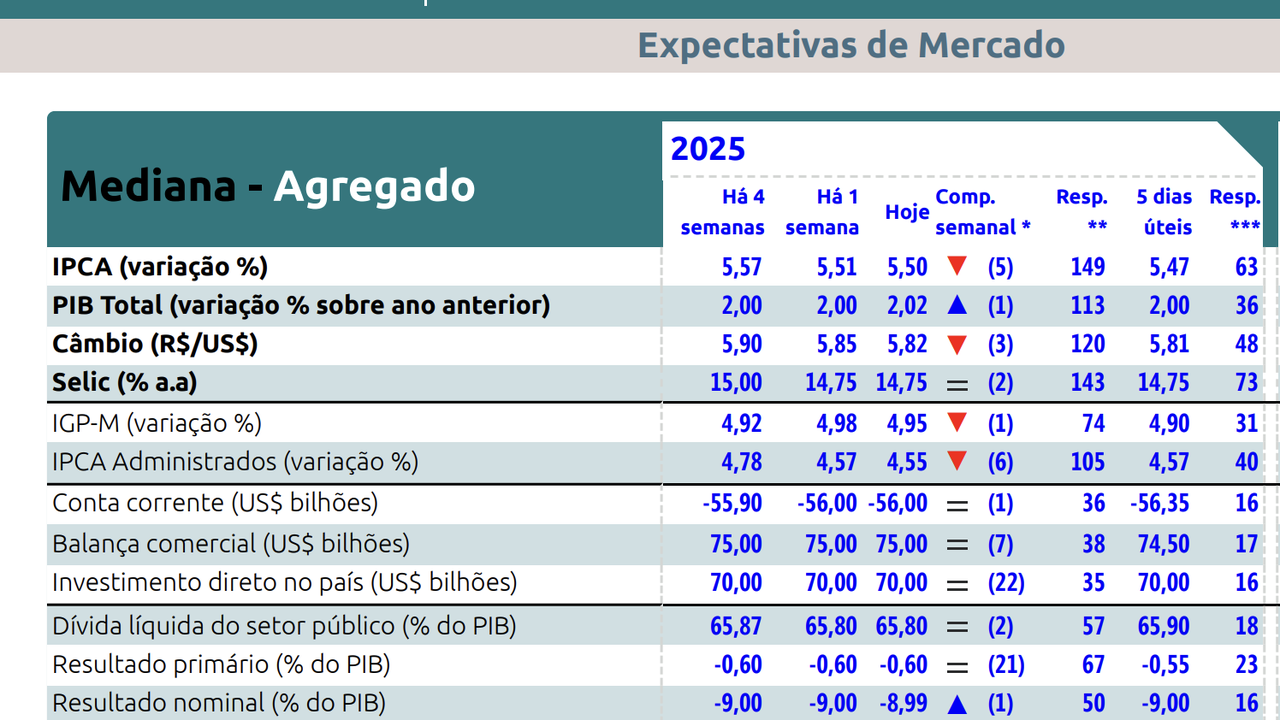 (Brasília-DF, 20/05/2025) O Banco Central divulgou na manhã desta segunda-feira, 19, o seu relatório de pesquisa Focus que foi encerrado, fechado, na sexta-feira, 16. Os números revelaram pela quinta semana seguida houve uma leve redução na estimativa do IPCA, a inflação oficial, que fiou em 5,51%.
