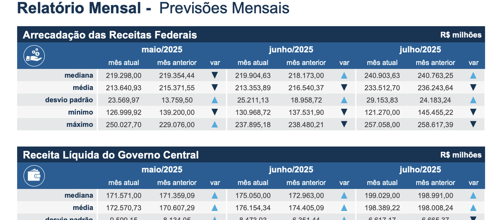 A SPE também constatou uma leve melhora nas expectativas sobre a receita líquida do Governo Central, com alta de R$ 171,35 bilhões em abril para R$ 171,57 bilhões em maio. Já para o resultado de 2025, os analistas preveem a receita líquida chegando a R$ 2,31 trilhões, valor superior à mediana de abril, que foi de R$ 2,30 trilhões.