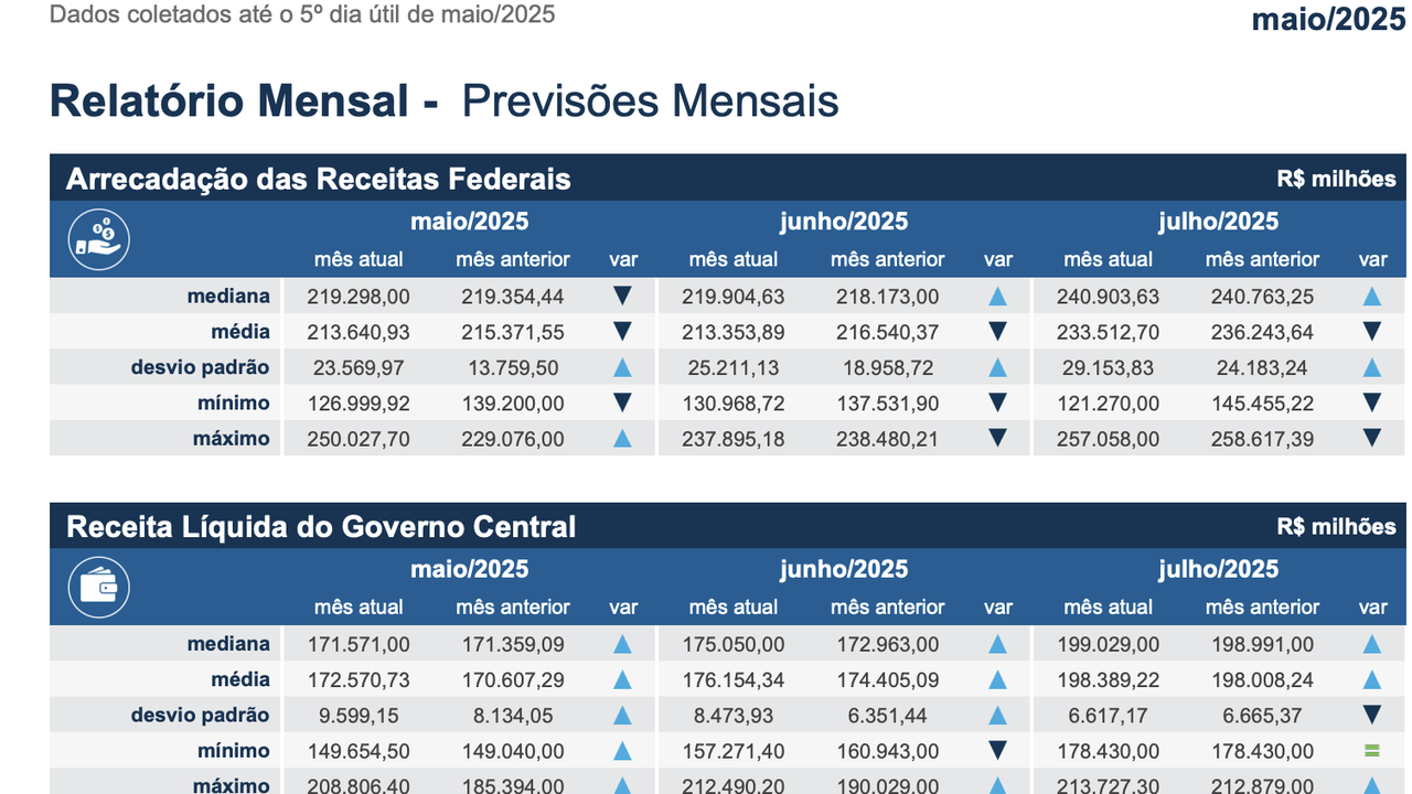 A previsão dos agentes de mercado sobre a arrecadação das receitas federais no ano de 2025 ficou em torno de R$ 2,84 trilhões, mesmo patamar da coleta de abril. Comparando a previsão para o ano desta coleta de maio com aquela feita em janeiro de 2024, observa-se aumento de R$ 160 bilhões na arrecadação federal estimada. Para o próximo ano, a projeção se manteve em cerca de R$ 3,02 trilhões, mesma faixa observada em abril.