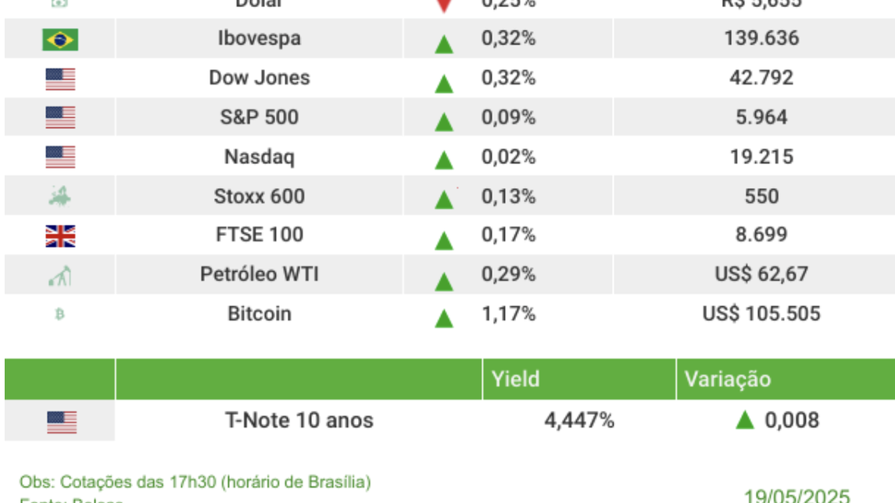 (Brasília-DF, 20/05/2025). Nesta segunda-feira, 19, Ibovespa subiu renovou sua máxima histórica. O principal índice da B3 avançou 0,32%, aos 139.636 pontos.