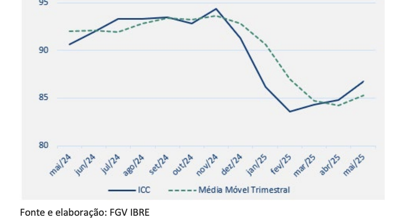 (Brasília-DF, 27/05/2025) Na manhã desta segunda-feira, 26, o FGV-IBRE divulgou dados da sua pesquisa que trata do Índice de Confiança do Consumidor (ICC) que avançou avançou 1,9 ponto, para 86,7 pontos. Em médias móveis trimestrais, o índice subiu 1,1 ponto, para 85,3 pontos.