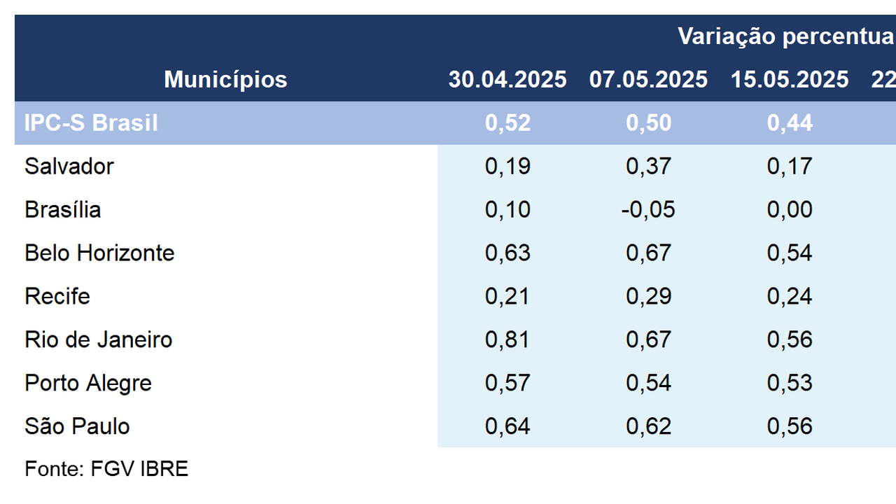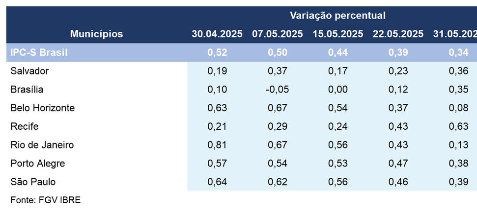 (Brasília-DF, 04/06/2025) Também na manhã desta terça-feira, 03, a FGV-IBRE divulgou que quatro das sete capitais pesquisadas registraram decréscimo em suas taxas de variação