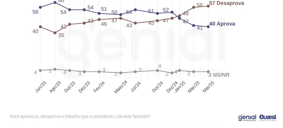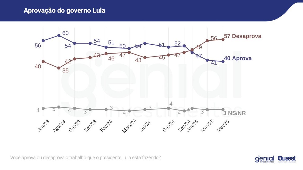 Pesquisa Genial/Quaest mostra que a desaprovação do Governo Lula segue alta e chega a 57% em maio/25. A aprovação está em 40%, o menor nível da série histórica.