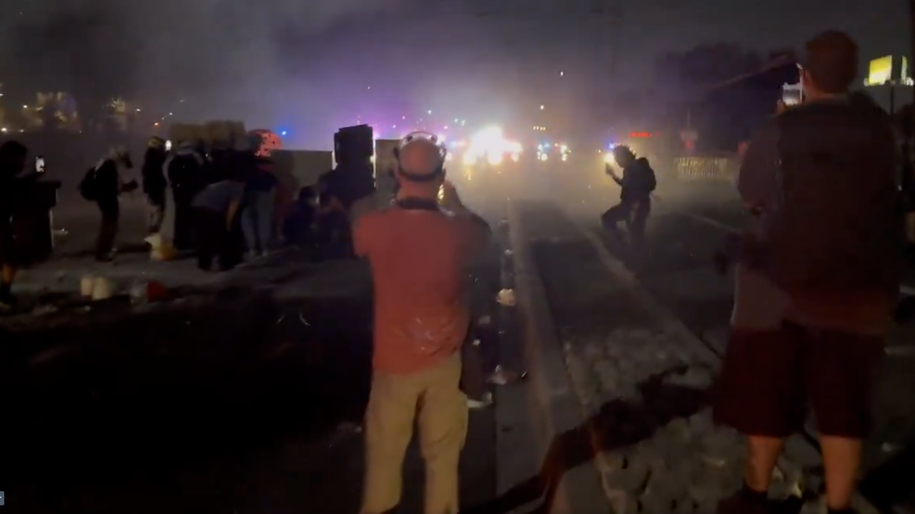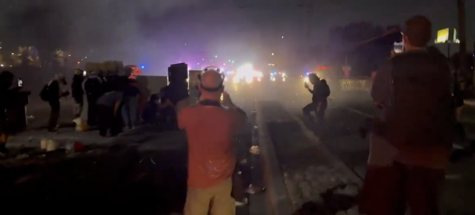 Oficiais do Condado de Los Angeles dispararam granadas de efeito moral e gás lacrimogêneo a cada poucos minutos para dispersar os manifestantes.