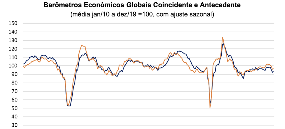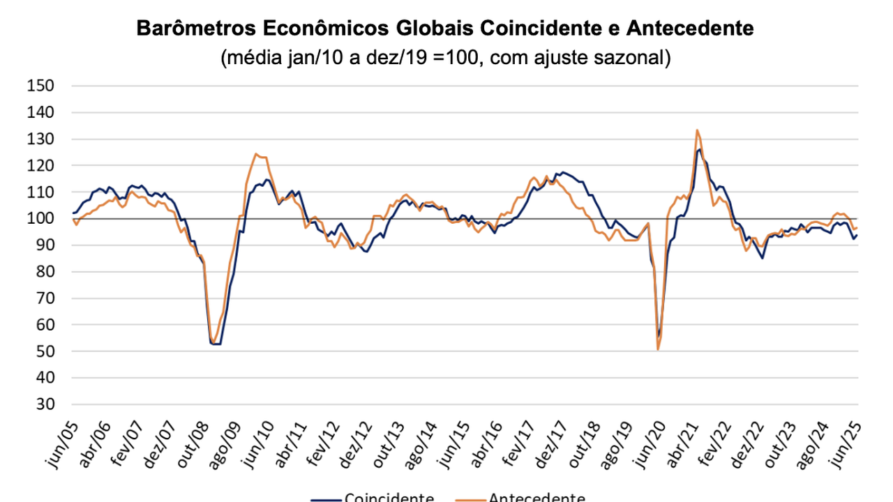 O Barômetro Econômico Global Coincidente sobe 1,4 ponto em junho, atingindo 93,8 pontos, com alta nas três grandes regiões da pesquisa. Já o Barômetro Antecedente sobe modestamente, em 0,4 ponto, para 96,5 pontos, influenciado por um avanço apenas na região do Hemisfério Ocidental, enquanto as demais regiões caminharam em sentido oposto.