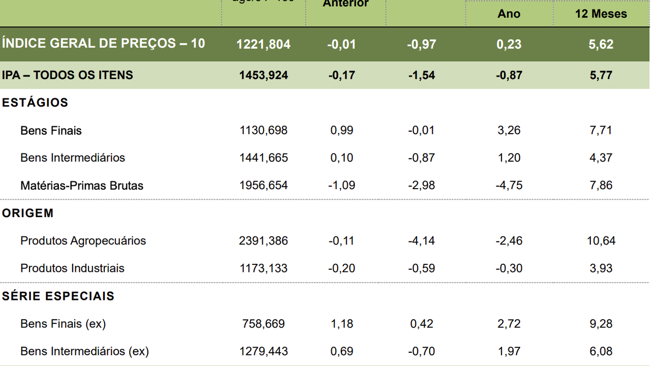 Com esse resultado, o índice acumula alta de 0,23% no ano e 5,62% nos últimos 12 meses. Em junho de 2024, o IGP-10 havia subido 0,83% no mês e apresentava alta acumulada de 1,79% em 12 meses.