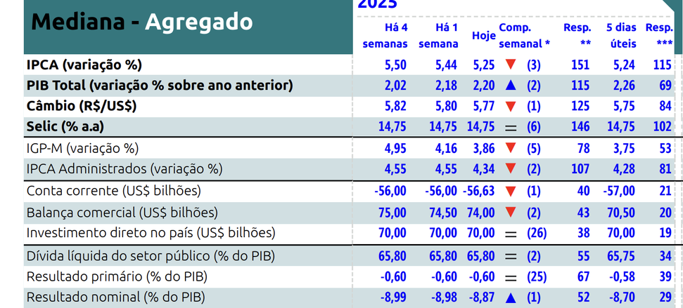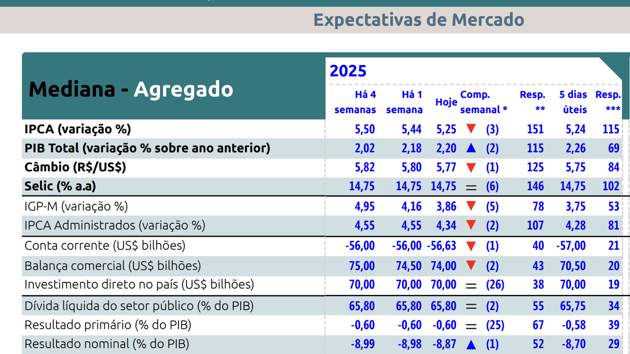 FOCUS: Mercado estima nova queda da inflação com IPCA ficando 5,25% e o crescimento econômico foi estimado em evolução, 2,20%