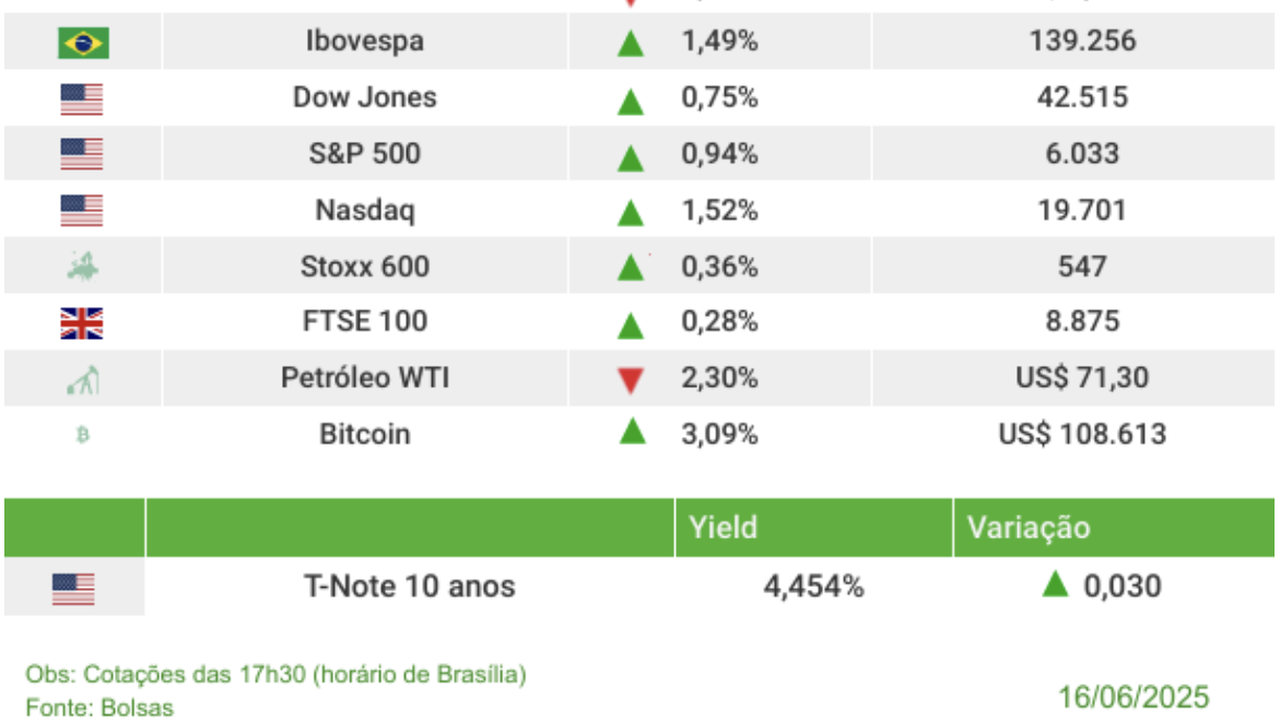 (Brasília-DF, 17/06/2026) Em meio ao 4º dia de conflito entre Israel e Irã, bolsa brasileira tem alta destacada e o dólar cai fortemente.