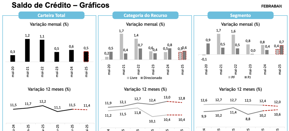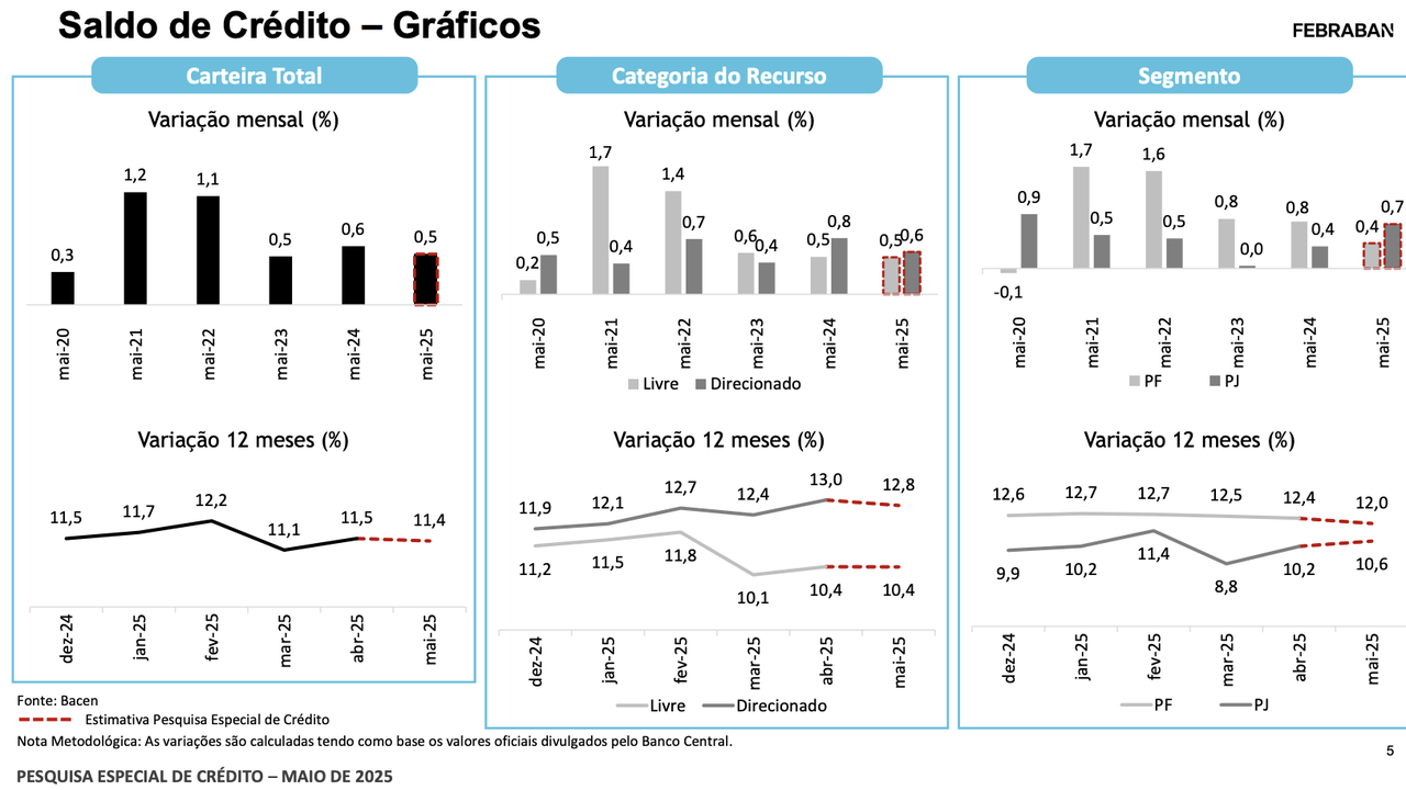 (Brasília-DF, 24/06/2025). Na manhã desta segunda-feira, 23, a Federação Brasileira de Banco divulgou a sua Pesquisa Especial de Crédito da Febraban apontando que o saldo total da carteira de crédito deve crescer 0,5% em maio.